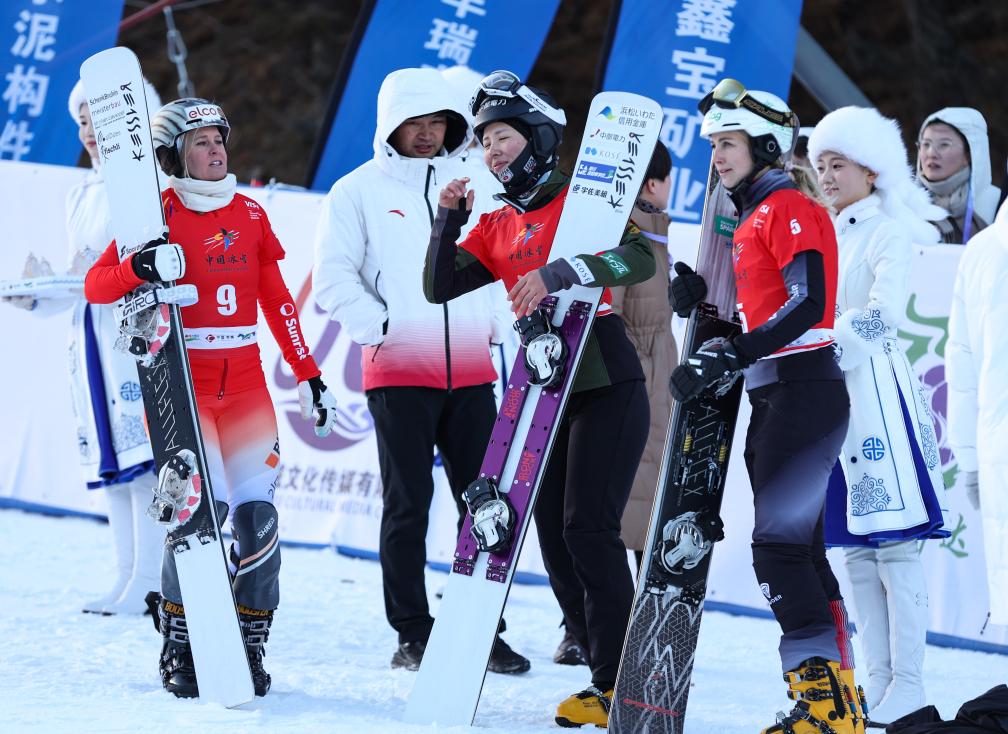 12月7日,女子组冠军日本选手三木椿(前中)、亚军瑞士选手朱莉·佐格(前左)、季军奥地利选手萨比娜·派尔(前右)在颁奖仪式现场进行交流。