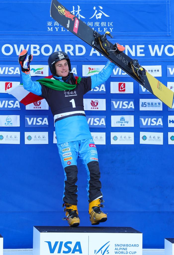 12月6日,男子组冠军意大利选手米尔科·费利切蒂(中)、亚军德国选手斯特凡·鲍迈斯特(左)、季军意大利选手毛里齐奥·博尔莫利尼在颁奖仪式上庆祝。 当日,国际雪联单板滑雪平行项目世界杯美林站平行大回转比赛在内蒙古赤峰市喀喇沁旗顺利收官。意大利选手米尔科·费利切蒂获得男子组冠军,日本选手三木椿获得女子组冠军;德国选手斯特凡·鲍迈斯特获得男子组亚军,意大利选手毛里齐奥·博尔莫利尼获得男子组季军;瑞士选手朱莉·佐格获得女子组亚军,奥地利选手萨比娜·派尔获得女子组季军。